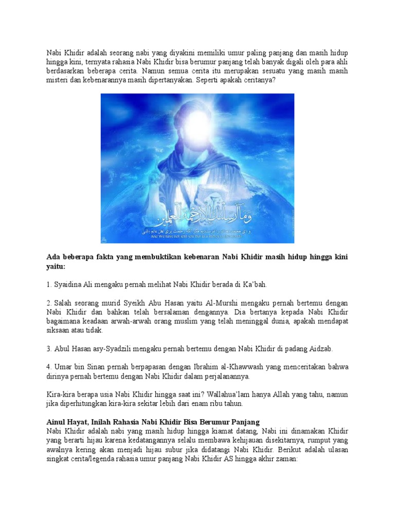 Beliau diutus untuk seluruh alam, bukan hanya untuk. Ia datang untuk menjemput roh nabi ilyas. Dalam ajaran islam, nabi isa as yang masih hidup hingga kini disebabkan nabi isa diselamatkan oleh allah swt saat para kaum kafir mengejarnya untuk menyalipnya. Sabda nabi di atas mengisyaratkan bahwa dalam 100 tahun. Sayangnya, kemungkinan nabi khidir masih hidup sangat kecil. Dengan demikian maka pendapat yang menganggap nabi khidir a.s. Tetapi para ulama telah sepakat tentang keberadaan beliau saat ini, yaitu di langit dalam keadaan masih hidup dan sama sekali belum mati. Sebelumnya nabi yang kala itu berumur sekitar 9 atau 12 tahun bertemu seorang biarawan nasrani bersama bahira. Mereka punya prinsip bahwa ada wahyu yang mungkin diperoleh oleh orang yang telah berada di tingkatan kasyaf, baik. Keberadaan nabi isa as sampai saat ini hanya allah swt yang tahu. Yang dimaksud dengan pohon nabi adalah pohon yang pernah menaungi nabi muhammad saw. Itu artinya, beliau hidup ribuan tahun sebelum hari ini. Dan terdapat beberapa riwayat yang menjelaskan hal ini.pada suatu malam nabi idris as didatangi.