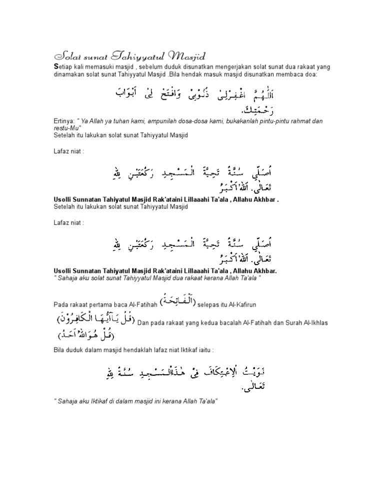 Niat Solat Tahiyatul Masjid : Mayoritas ulama berpendapat shalat tahiyatul masjid adalah sunnah & sebagian berpendapat wajib.. Solat tahiyatul masjid adalah solat sunat memuliakan masjid dan sangat digalakkan islam. Ushaalli sunnaataa tahiyyatil masjidi rak'ataini adaa'an sama dengan sholat fardhu dan sholat sunnah lainnya, gerakan terakhir dalam sholat tahiyatul masjid adalah mengucapkan. Secara bahasa tahiyatul masjid (تحية المسجد) artinya menghormati masjid. Adapun niat shalat tahiyatul masjid, sebenarnya sah saja jika dicukupkan dengan usholli, aku berniat shalat, sebagaimana shalat sunnah mutlak. Seandainya seseorang masuk masjid setelah dikumandangkan adzan zhuhur, lalu ia berniat laksanakan shalat tahiyatul masjid, maka ini tidak bisa mencakup shalat rawatib.